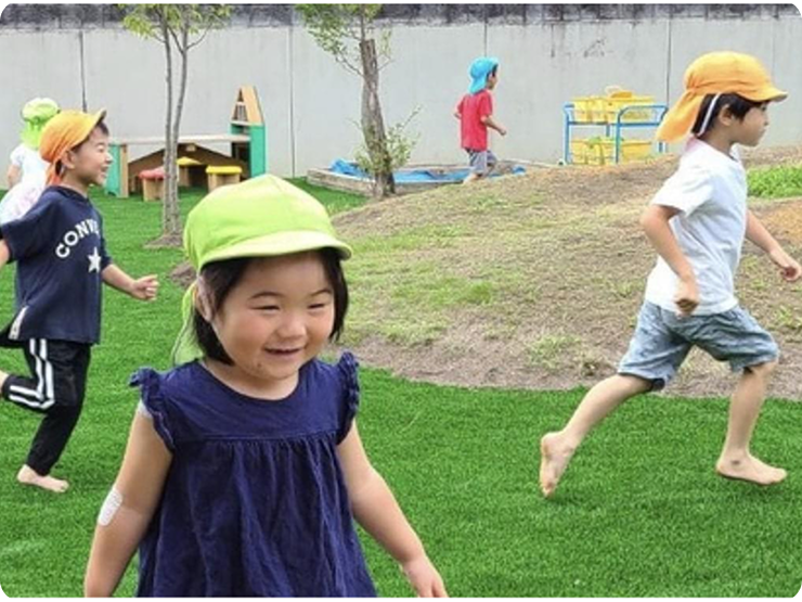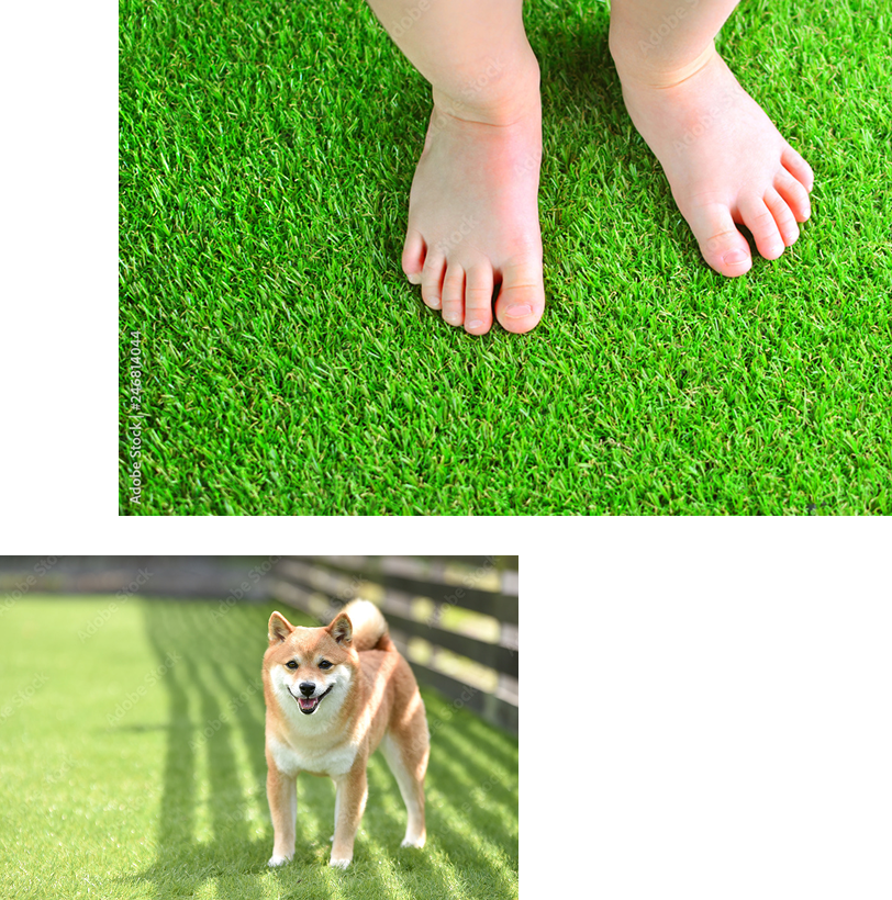 2熱くないから裸足で走れる。 一般的な人工芝は、炎天下に照らされると70℃を超えることもあります。 弊社のCOOOL Turf®(クールターフ)は、天然素材100%の冷却目土充填材である「寒土 -KANDO®-」を使用しているため、ゴムチップの人工芝と比べて最大20℃も温度が低く、クッション性もあるため、一般的な人工芝よりも体への負担も軽減されます。そのため、子どもたちが裸足でのびのびと自然を感じながら走り回ることができ、ドッグランでもわんちゃんの足を守りながら、家族みんなで快適な時間を過ごすことができます。