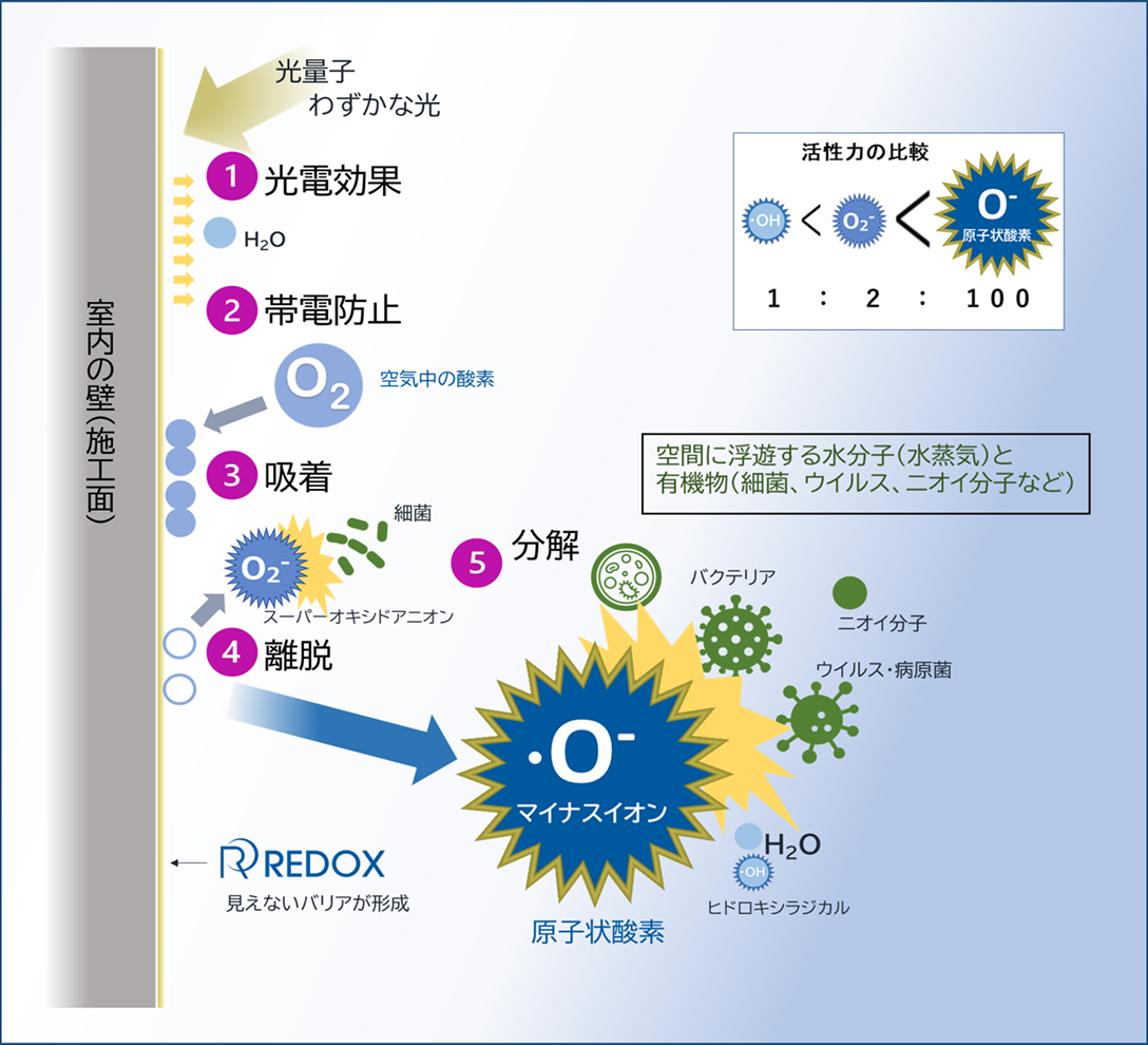 - 原子状酸素(マイナスイオン)は、浮遊する有機物を分解する。