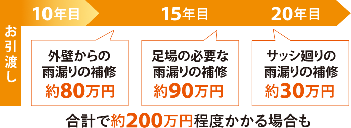 一般的なケースでは、60万円~90万円程度の補修費用が必要と言われています。場合によっては、200万円以上のお金が必要なこともあります。長期保証制度では、突然の不具合発生時にも、費用負担なく補修をさせていただきます。