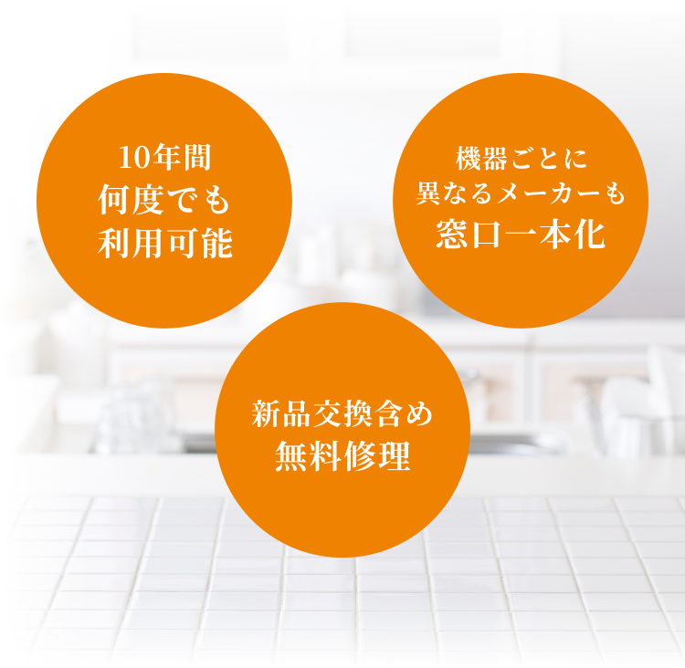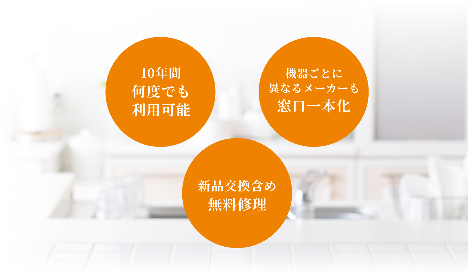 住宅設備機器に保証対象となる故障や不具合が発生した場合、10年間無料で出張修理や部品交換が受けられます。