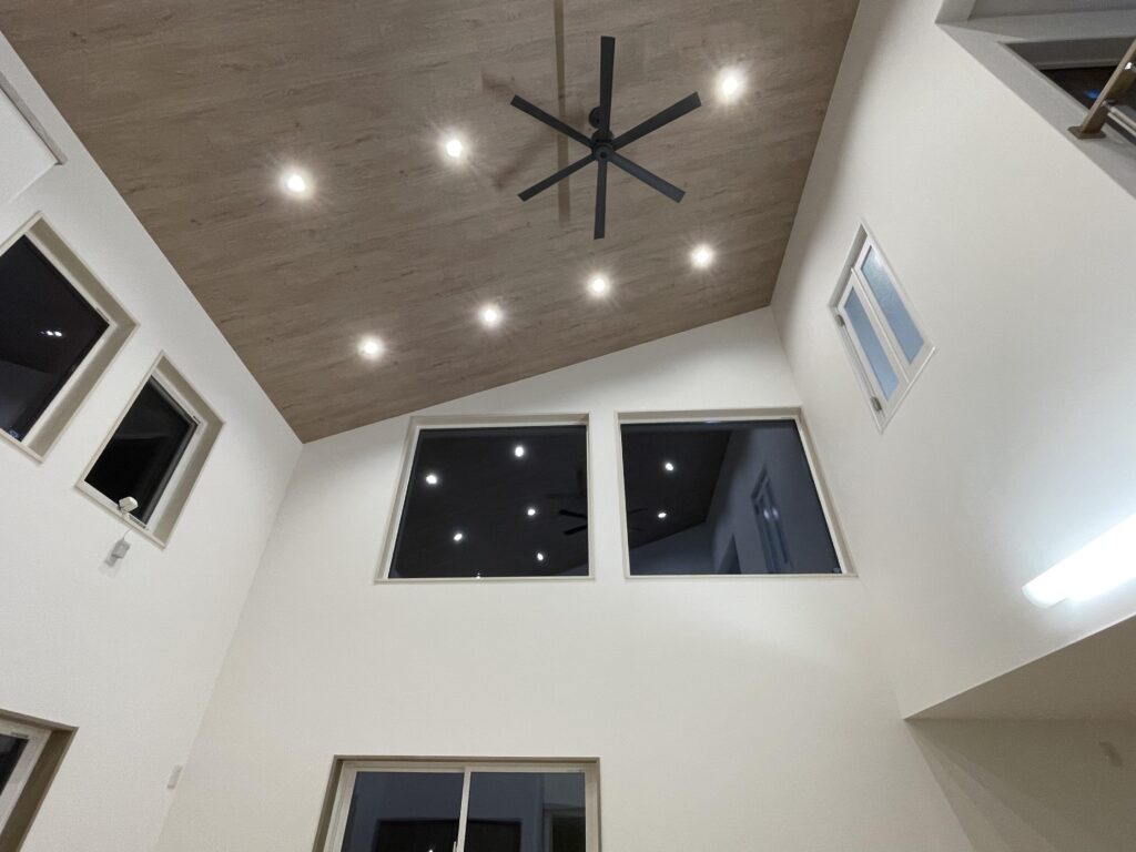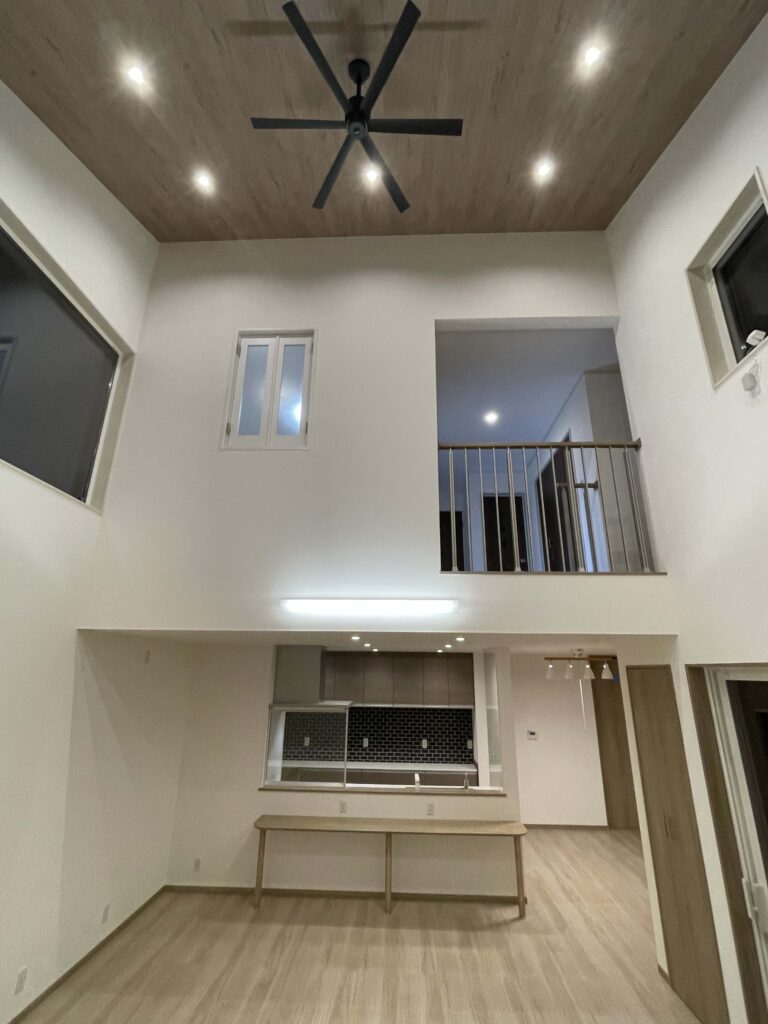 吹抜けの高い天井にシーリングファンを設置し、室内の空気を効率的に循環。上下の温度差を解消し、冷暖房効果を高めます。