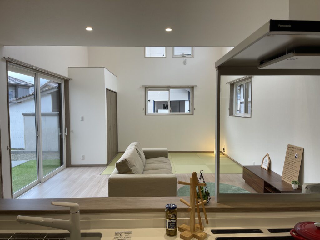 広さと明るさにこだわった、ゆったりとしたリビング空間です。家族がのびのびと過ごせる心地よさがあり、来客時も余裕をもって迎えることができます。