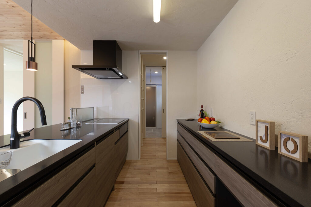 水栓までもブラックカラーで統一しました。重厚な佇まいがLDK全体の雰囲気を引き締めます。