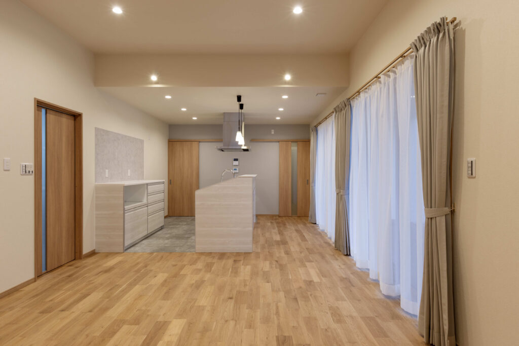 天井高3mの空間に南側の大開口からやさしい光が差し込むリビング
